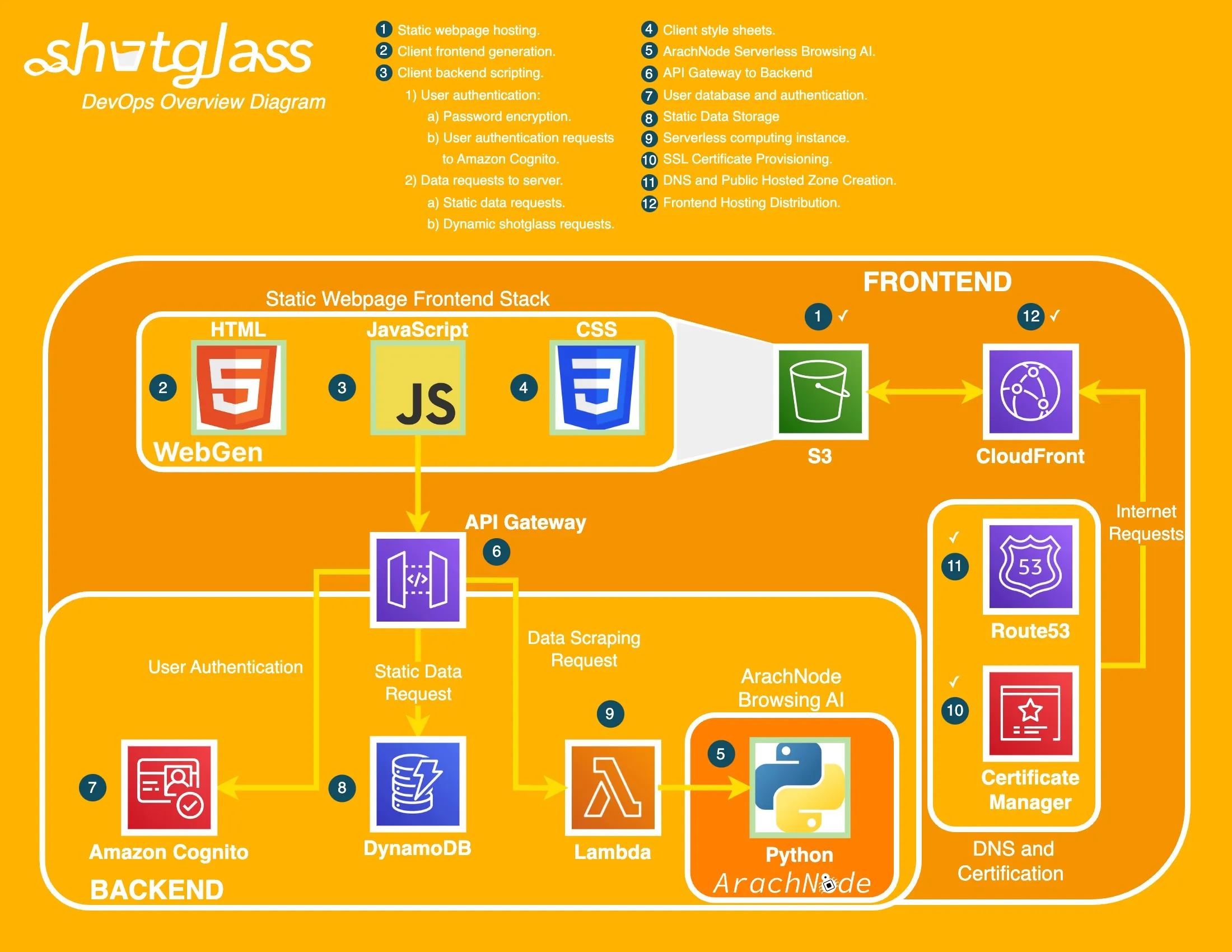 The solution, Shotglass Jobs, involved designing a web application that utilized data scraping techniques to gather job postings from various platforms. This is to be implemented using the ArachNode AI developed in my simultaneous project. The application assesses the relevance of these postings based on user profiles and preferences and provides an automated submission process using a Selenium Python routine. The entire application is hosted on AWS, leveraging services like S3, Route53, Cloudfront, Cognito User Database, DynamoDB, API Gateway, and AWS Lambda to ensure scalability, security, and performance.