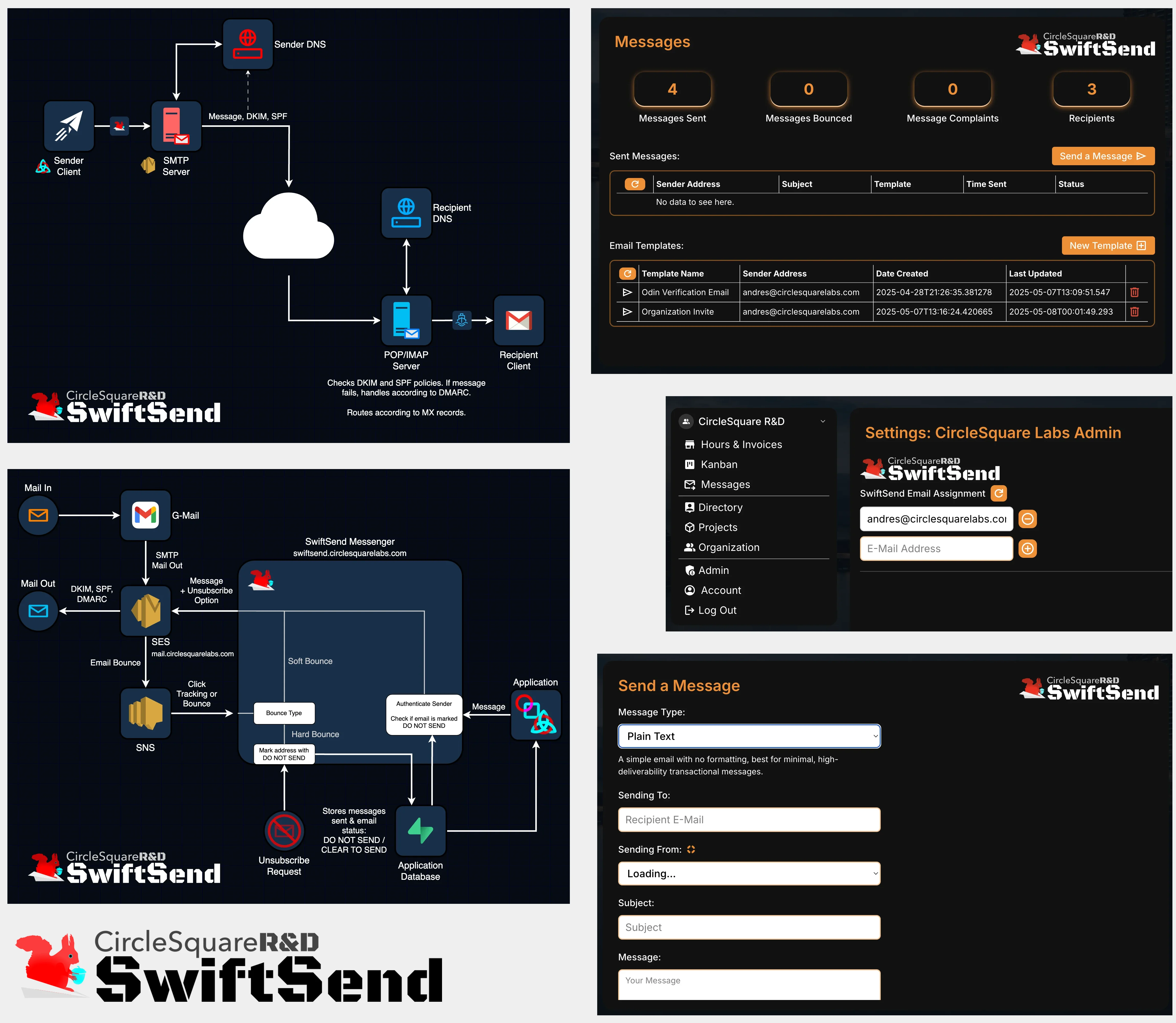 SwiftSend was conceived out of a growing need within CircleSquare Labs and its affiliated consulting firms to deliver email communications at scale-internally and externally-without relying on costly third-party services. Given the wide range of clients and contractors managed through CircleSquare’s Odin Dashboard, the team required a unified platform for drafting, sending, and tracking both HTML and plain text messages. Whether for project solicitations, onboarding instructions, or internal notices, these communications had to be secure, auditable, and cost-effective. The additional challenge was to create a reusable and extendable backend service that could operate independently, support scalable deployments, and preserve sender reputation-critical for avoiding blacklists and ensuring deliverability. All of this had to be built under tight cost constraints and within the bounds of AWS SES's strict policies and sandbox limitations, which posed unique barriers for newer organizations.