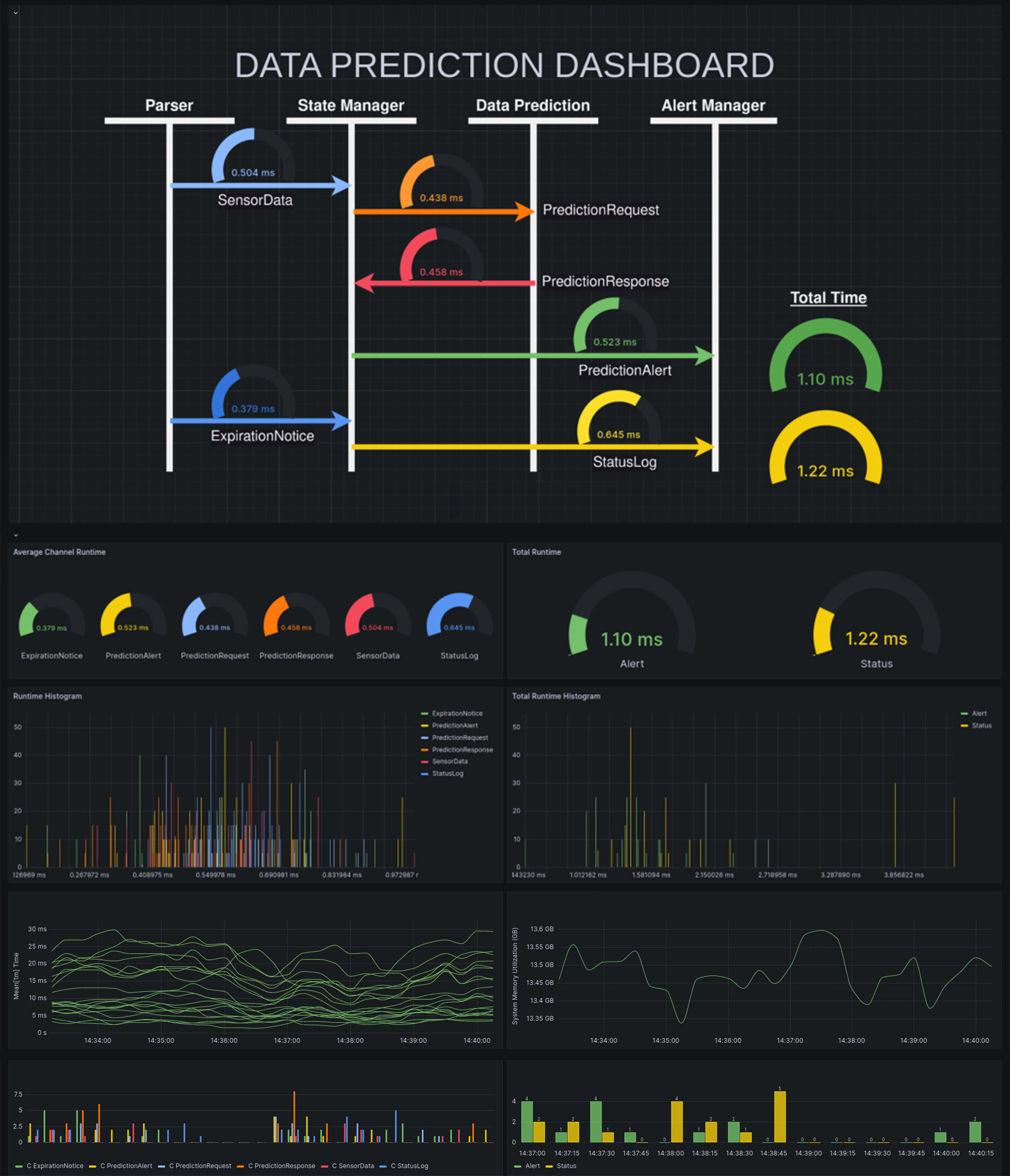 Containerized with Docker and orchestrated with Kubernetes, the C++ and Golang microservices communicate over an internal network using the RTI DDS publisher/subscriber messaging service by Real-Time Innovations. Telemetry collected through an external Golang microservice is aggregated by Prometheus and displayed on a Grafana dashboard. Machine processing metrics are collected using Node Exporter, providing CPU and Memory usage. The Grafana dashboard is edited using a JavaScript plugin to produce custom graphics.